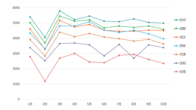 我們將15個(gè)新一線城市今年1-10月關(guān)于智慧城市的搜索數(shù)據(jù)綜合處理,得到了下面這張走勢圖。從圖中可以看出,雖然2月份的搜索數(shù)據(jù)出現(xiàn)突然下降,但截至10月份,整體上針對(duì)“智慧城市”保持了很高的搜索熱度,各月數(shù)據(jù)的差別不是很大。這表明,對(duì)于新一線城市在智慧城市建設(shè)方面的動(dòng)向,公眾保持了持續(xù)的關(guān)注。