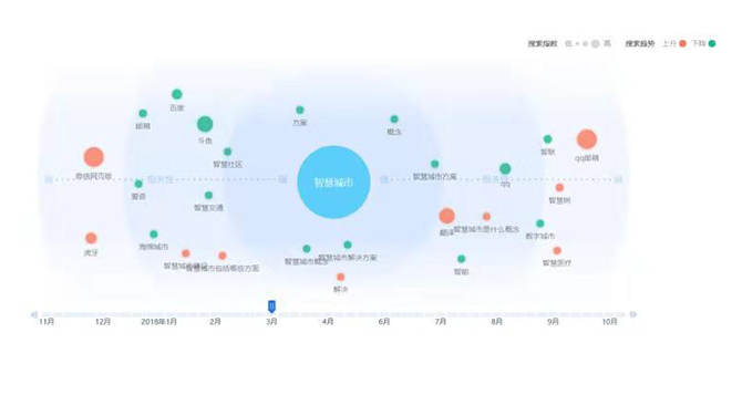 根據(jù)搜索熱詞,一定程度上可以看出公眾更加關(guān)注智慧城市的哪些方面。下面這張熱詞圖稍顯凌亂,從概念到解決方案這種更加具體的領(lǐng)域,都顯示出較強(qiáng)關(guān)注度。這也許反映出,對(duì)于新一線城市來說,智慧城市依然是個(gè)值得深耕的領(lǐng)域,相關(guān)建設(shè)處于起步階段,概念的普及依然有待加強(qiáng)。