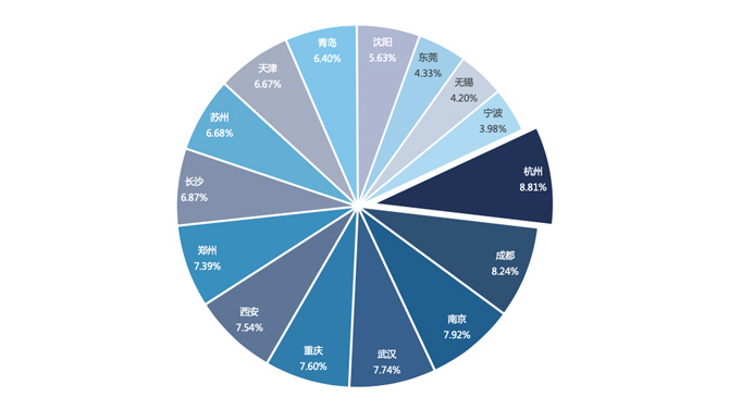 15個(gè)新一線城市在智慧城市搜索熱度上均保持了較高水準(zhǔn),其中,杭州、成都大體處于第一梯隊(duì),南京、重慶、武漢、蘇州、西安、天津、鄭州、長沙、沈陽、青島這10個(gè)城市處于第二梯隊(duì),而寧波、東莞、無錫3個(gè)城市則相對(duì)落后。