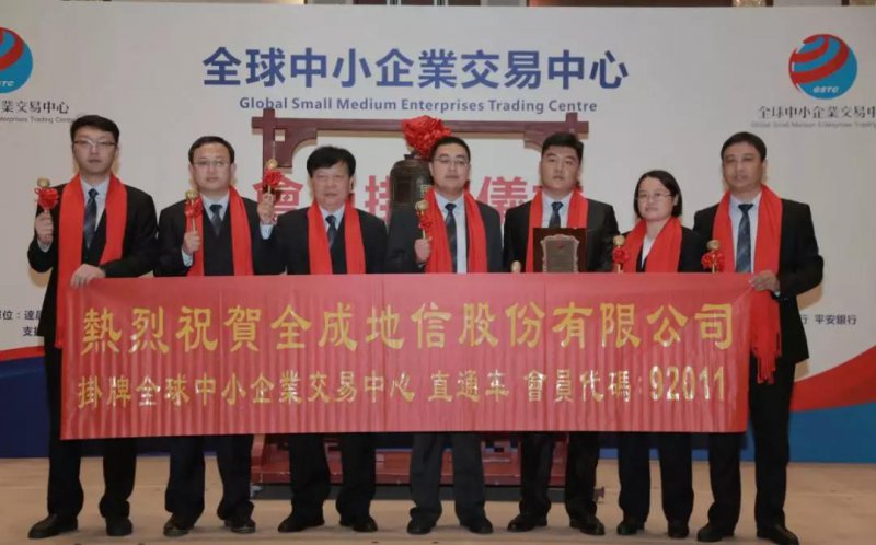 2019年1月8日,全成地信集團成功掛牌全球中小企業(yè)交易中心(會員代碼92011),掛牌敲鐘儀式在香港隆重舉行,全成地信集團執(zhí)行總裁王大威先生攜各部門代表出席了此次儀式,與來自兩岸三地的嘉賓共同見證了彼此企業(yè)邁向國際多層次市場的重要時刻。