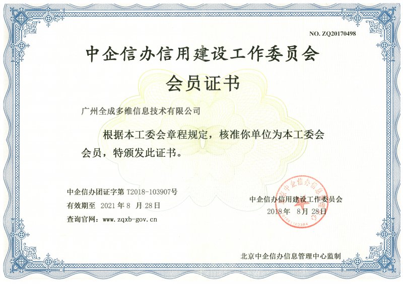 中企信辦信用建設(shè)工作委員會(huì)會(huì)員證書(shū)