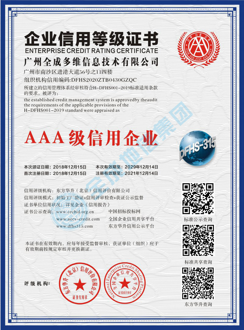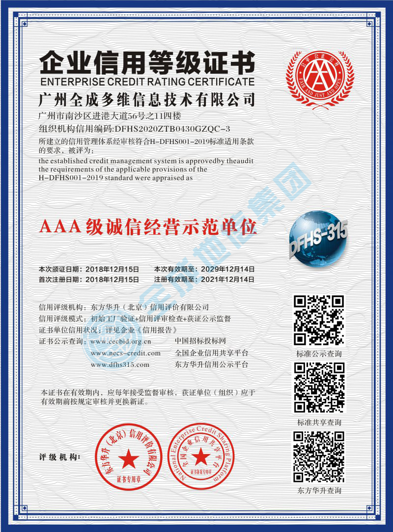 企業(yè)信用等級(jí)證書(shū)AAA級(jí)
